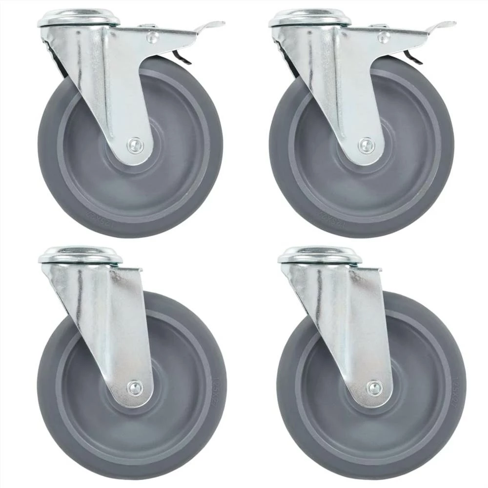 This set of 16 bolt hole swivel casters will be the perfect accessory for small equipment and furniture like workbench, trolley, coffee table, plant stand, bookshelf, shopping cart, etc. These casters are made of TPR (thermoplastic rubber) which is distinguished by a good shock and vibration resistance, enabling these casters to run smoothly and quietly. Additionally, their soft surfaces effectively protect your floor from scratching. Besides, the zinc-coated iron frame is highly rust-resistant and thus adds to the catser’s sturdiness and durability. Half of these swivel casters are equipped with brakes for flexible control. Each caster has a maximum loading capacity of up to 80 kg. Delivery includes 8 bolt hole swivel casters and 8 bolt hole swivel casters with brakes.