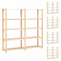 Our solid wooden storage rack is an ideal solution to both household and commercial storage, such as kitchen, laundry room, basement, bathroom, office, garage, workshop, or anywhere else you may need additional storage space, providing plenty of room to keep all items neatly organised. Made of solid pinewood, the storage shelf is extremely durable! You can keep its natural colour or add a coat of paint or other finish in your favourite colour. Thanks to the included mounting materials, our storage unit is easy to assemble. Delivery includes 5 racks.
