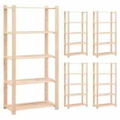 Our solid wooden storage rack is an ideal solution to both household and commercial storage, such as kitchen, laundry room, basement, bathroom, office, garage, workshop, or anywhere else you may need additional storage space, providing plenty of room to keep all items neatly organised. Made of solid pinewood, the storage shelf is extremely durable! You can keep its natural colour or add a coat of paint or other finish in your favourite colour. Thanks to the included mounting materials, our storage unit is easy to assemble. Delivery includes 5 racks.