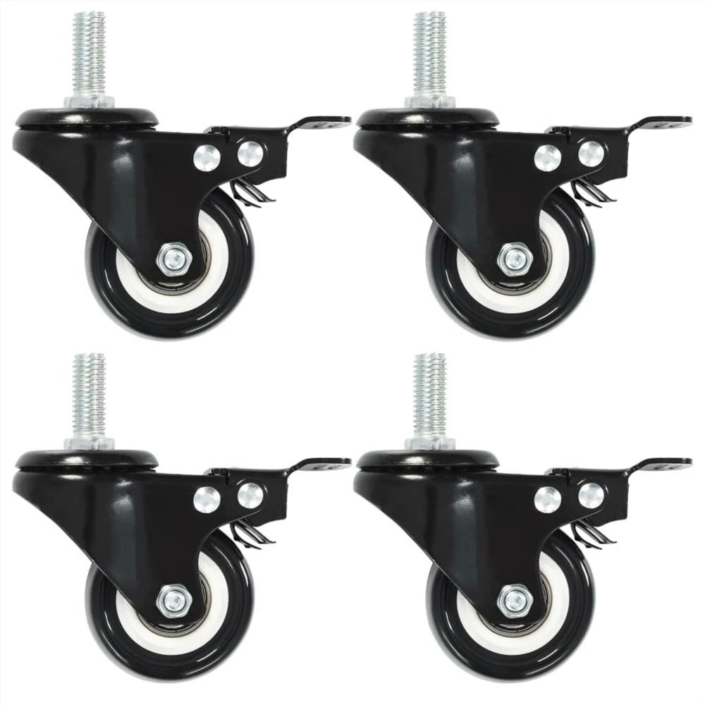This set of 8 swivel casters with brakes will be the perfect accessory for small equipment and furniture like workbench, trolley, coffee table, plant stand, bookshelf, shopping cart, etc. These casters are made of PU (polyurethane) which is distinguished by a good shock and vibration resistance, enabling these casters to run smoothly and quietly. Additionally, their soft surfaces effectively protect your floor from scratching. Besides, the iron frame is highly rust-resistant and thus adds to the catser’s sturdiness and durability. Additionally, these swivel casters are equipped with brakes for flexible control. Each caster has a maximum loading capacity of up to 50 kg. Delivery includes 8 swivel casters with brakes.