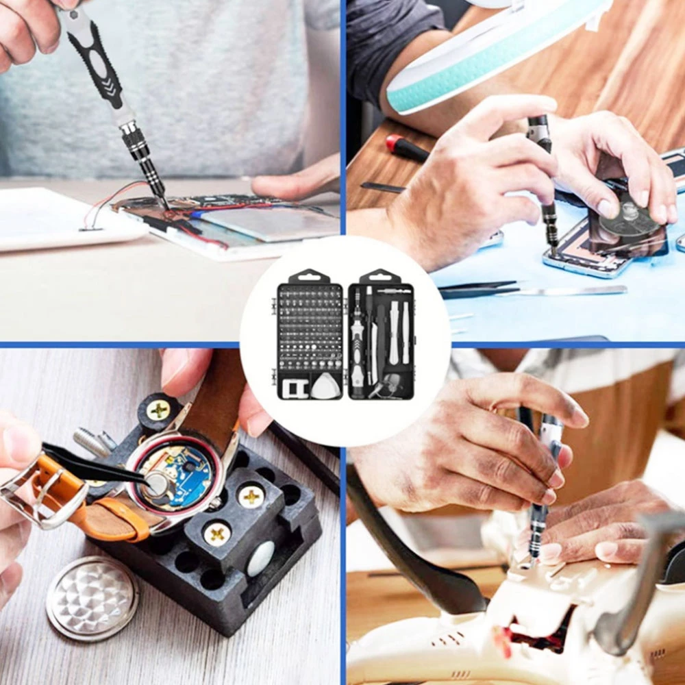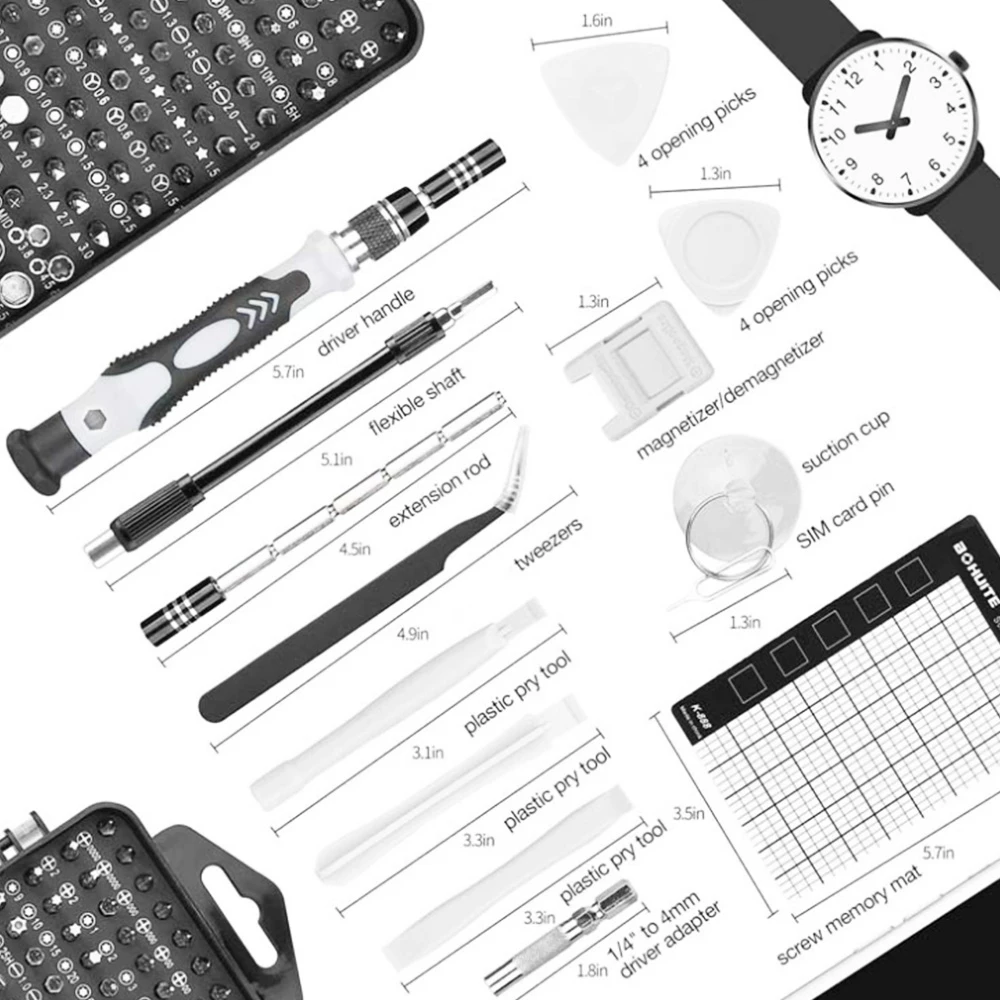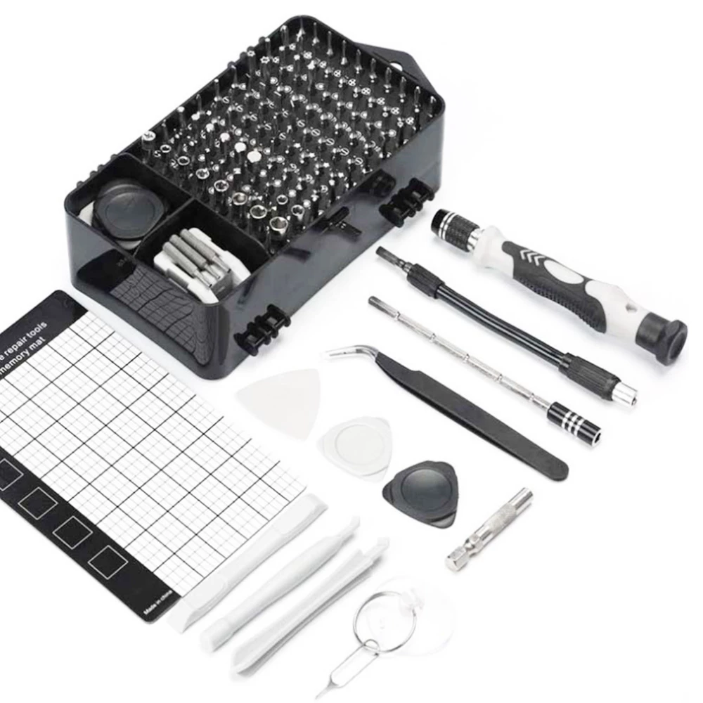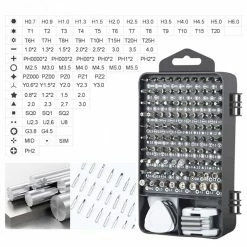 The 122 in 1 screwdriver set includes 98 screwdriver bits, 3TorxTR screwdriver bits, 1 magnetized driver handle, 1 magnetizer/demagnetizer, 1 flexible extension shaft, 1 hexagonal sleeve socket for cordless drills, 1 anti-static tweezer, 2 plastic pry crowbars,3 ultra-thin & 6 normal triangle pry tools, 1 micro screw magnetic pad, 1 SIM card pin and 1 suction cup.