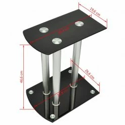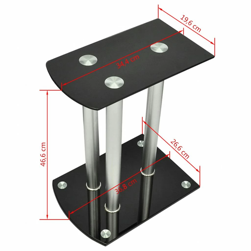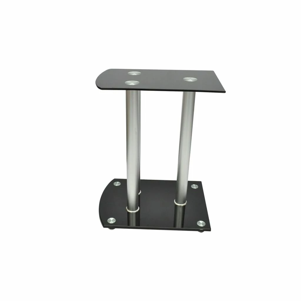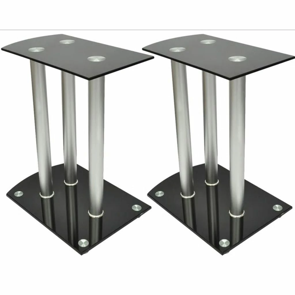 This pair of Speaker Stands has been made to compliment monitor speakers. The top and base plates of the Stand are made of safety glass. There are three aluminum pillars on each stand, which will provide sturdy support to the speakers. The modern elegant design blends well with any contemporary home environment. The four round spikes under the base plate help to reduce vibration and prevent your carpet or wood floor from being flattened or damaged by the base plate. They also make lifting of the stand easier. Delivery includes two speaker stands.