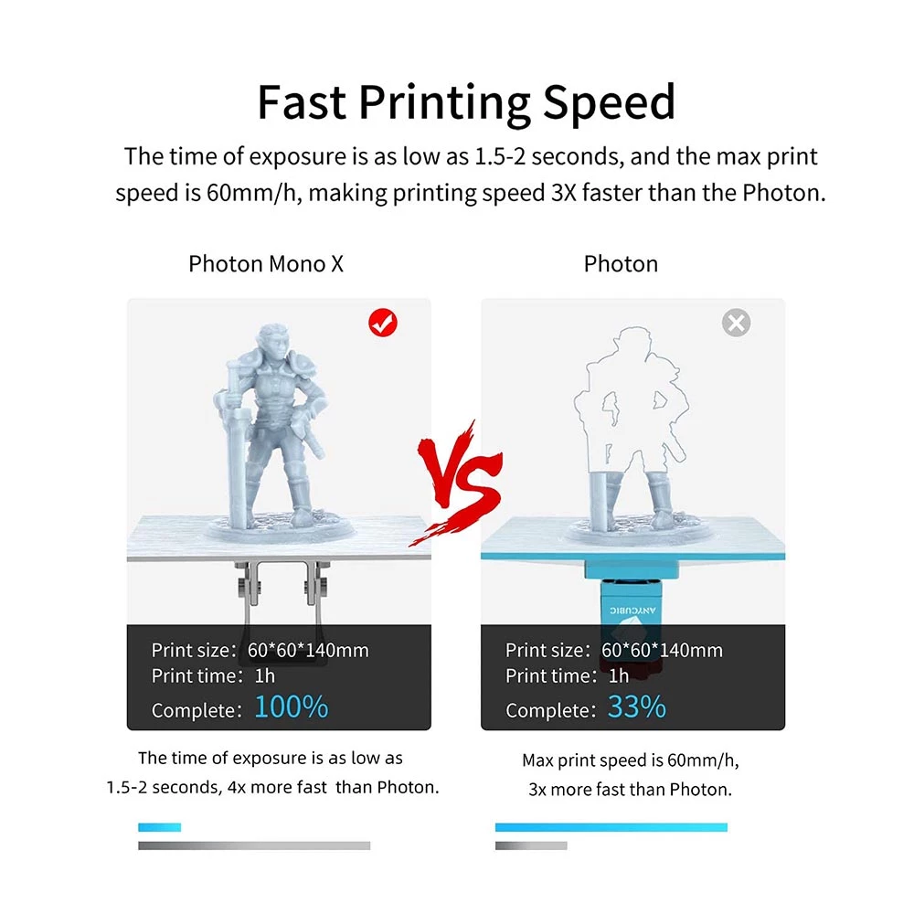 The time of exposure is as low as 1.5-2 seconds, and the max print speed is 60mm/h, making printing speed 3X faster than the Photon.