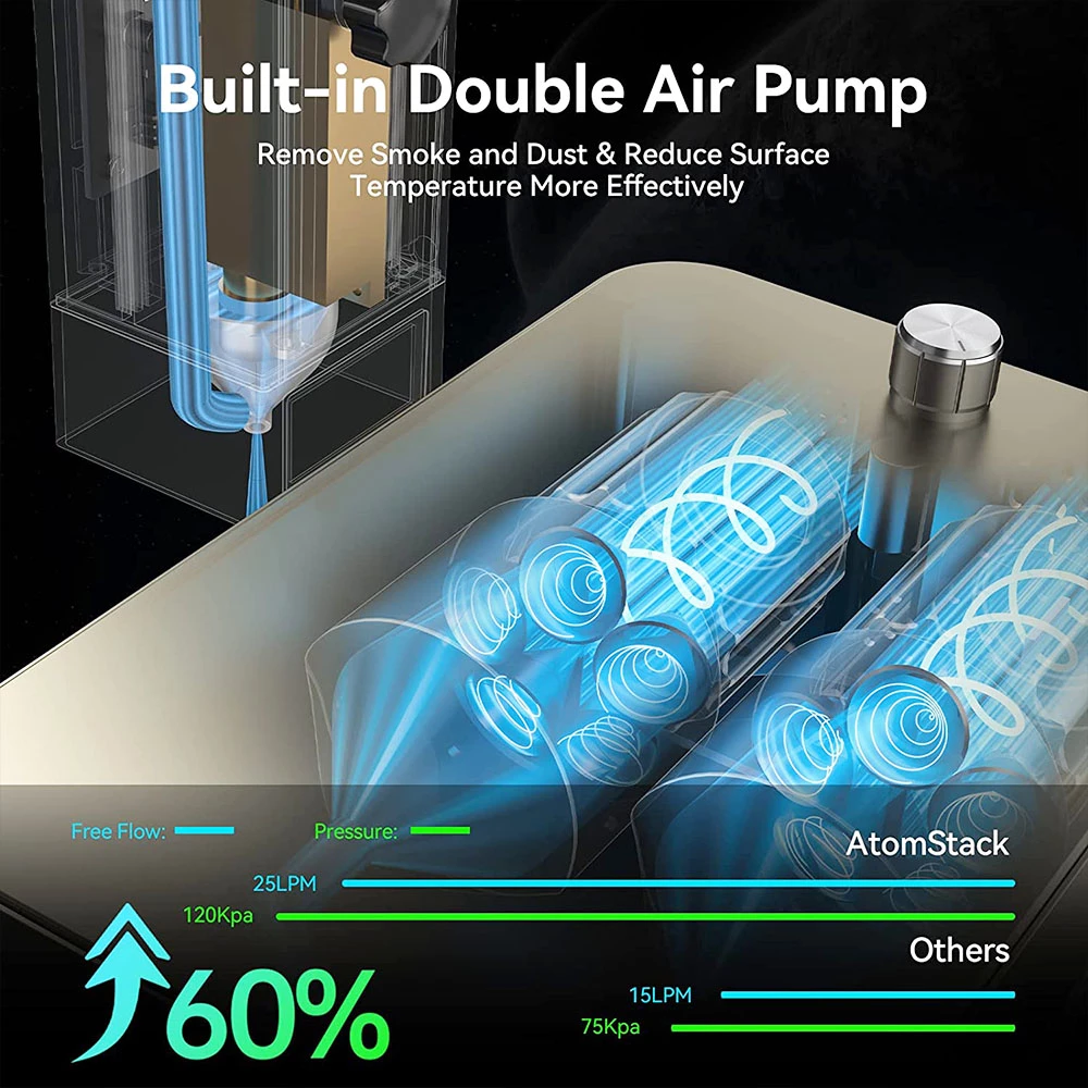 10-30L/Min air assist pump kit can improve the cutting and engraving speed with a cleaner surface, as well as considerably optimizes engraving works’ quality. The thick aluminum cover makes it stronger and more durable, generating less heat and lasting longer.