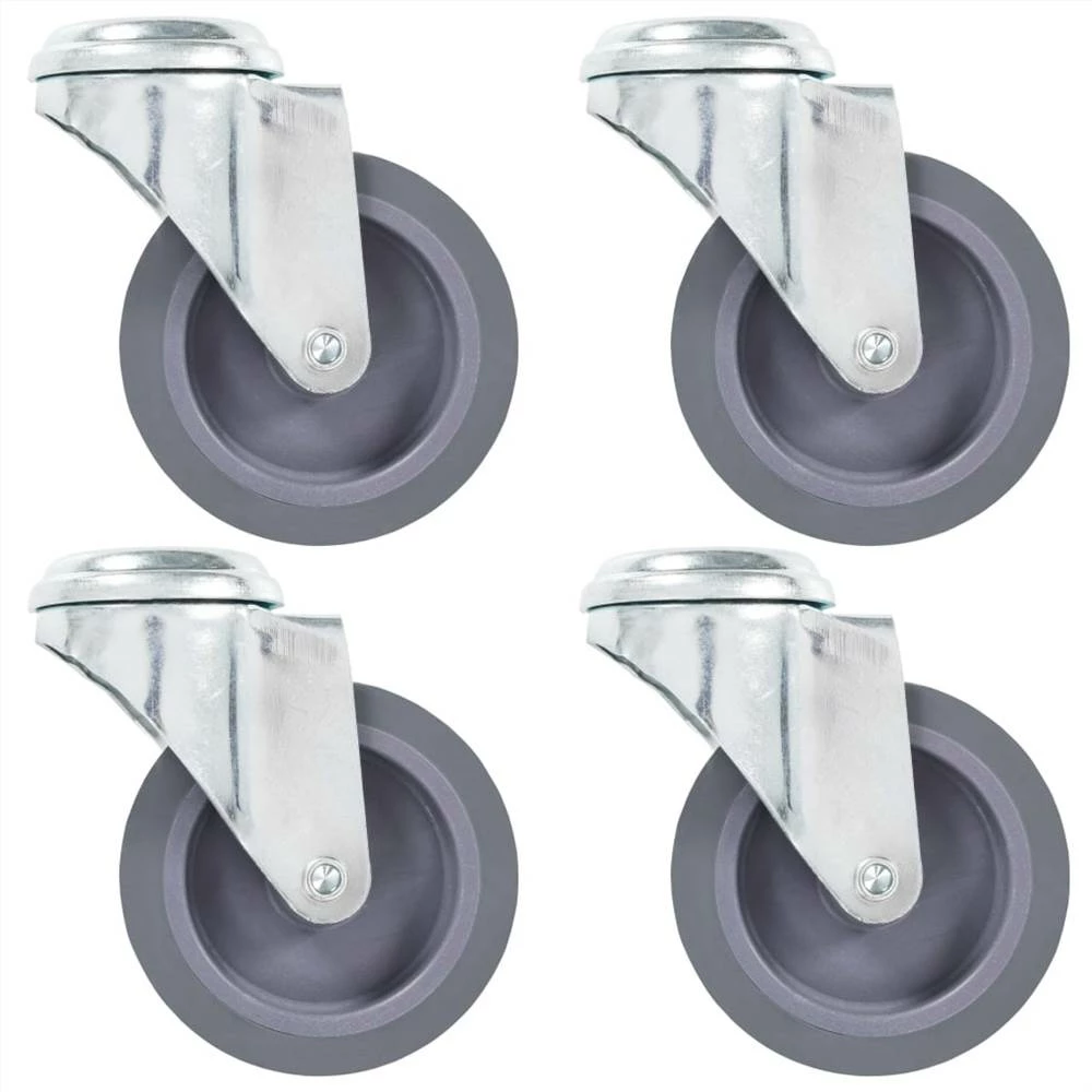 This set of 4 bolt hole swivel casters will be the perfect accessory for small equipment and furniture like workbench, trolley, coffee table, plant stand, bookshelf, shopping cart, etc. These casters are made of TPR (thermoplastic rubber) which is distinguished by a good shock and vibration resistance, enabling these casters to run smoothly and quietly. Additionally, their soft surfaces effectively protect your floor from scratching. Besides, the zinc-coated iron frame is highly rust-resistant and thus adds to the catser’s sturdiness and durability. Each caster has a maximum loading capacity of up to 45 kg. Delivery includes 4 bolt hole swivel casters.