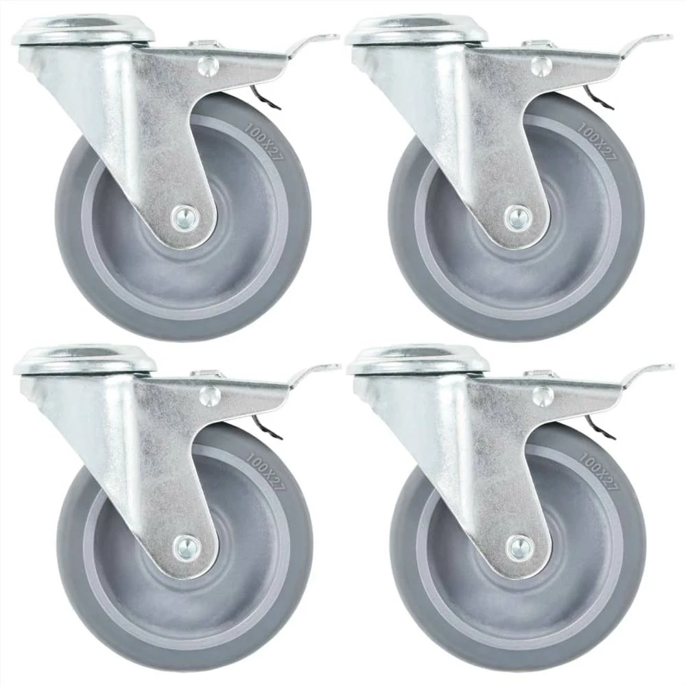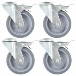 This set of 4 bolt hole swivel casters with double brakes will be the perfect accessory for small equipment and furniture like workbench, trolley, coffee table, plant stand, bookshelf, shopping cart, etc. These casters are made of TPR (thermoplastic rubber) which is distinguished by a good shock and vibration resistance, enabling these casters to run smoothly and quietly. Additionally, their soft surfaces effectively protect your floor from scratching. Besides, the zinc-coated iron frame is highly rust-resistant and thus adds to the catser’s sturdiness and durability. These swivel casters are equipped with double brakes for flexible control. Each caster has a maximum loading capacity of up to 60 kg. Delivery includes 4 bolt hole swivel casters with double brakes.