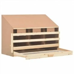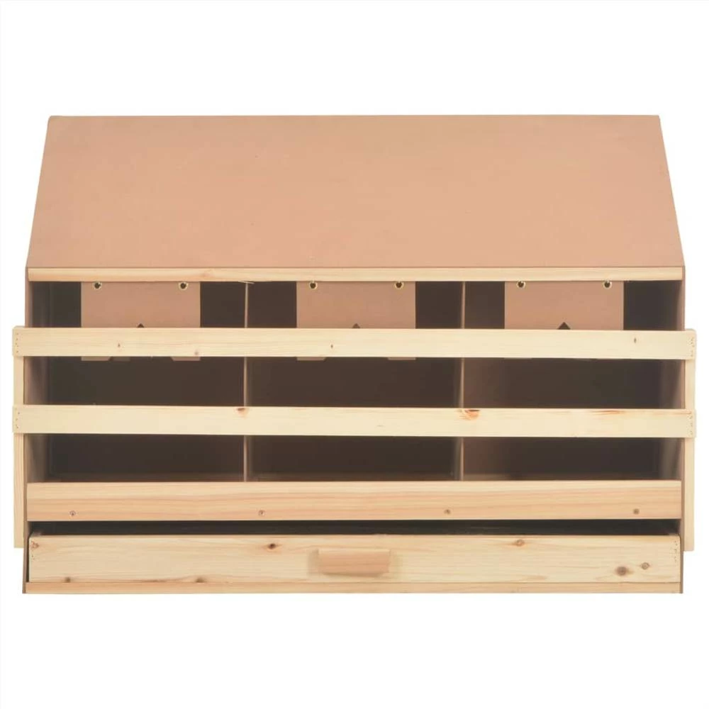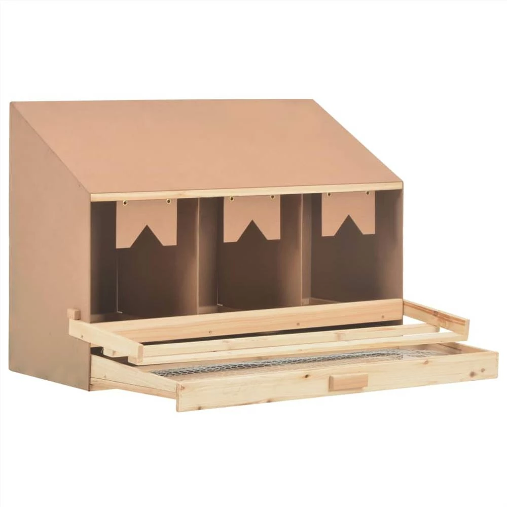This wooden nesting box will provide your chickens a comfortable and sheltered place to lay eggs! The 3 spacious compartments allow 3 large hens to settle and lay eggs. The eggs will gently fall through the holes on the floor and into the underlying drawer, which makes it easy to pick up eggs. Removable bottom layer allows you to clean up easily. Perches can be folded up to prevent night roosting. The sloping roof makes it difficult for chickens to sit up and contaminate eggs. You can check our shop for chicken nesting boxes with flat roof. Made from solid pine wood and MDF, the poultry laying nest is built for long-term use. The nesting box is easy to assemble.