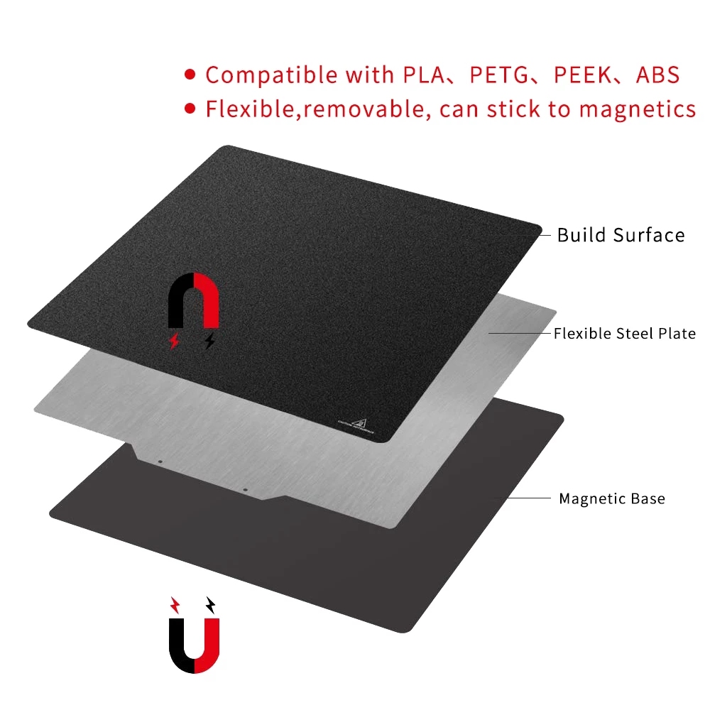 1. This steel plate is flexible, removable, and can stick to magnetics very well. It is compatible with PLA, PETG, PEEK, and ABS. Besides, it can be heated up to 110 celsius.