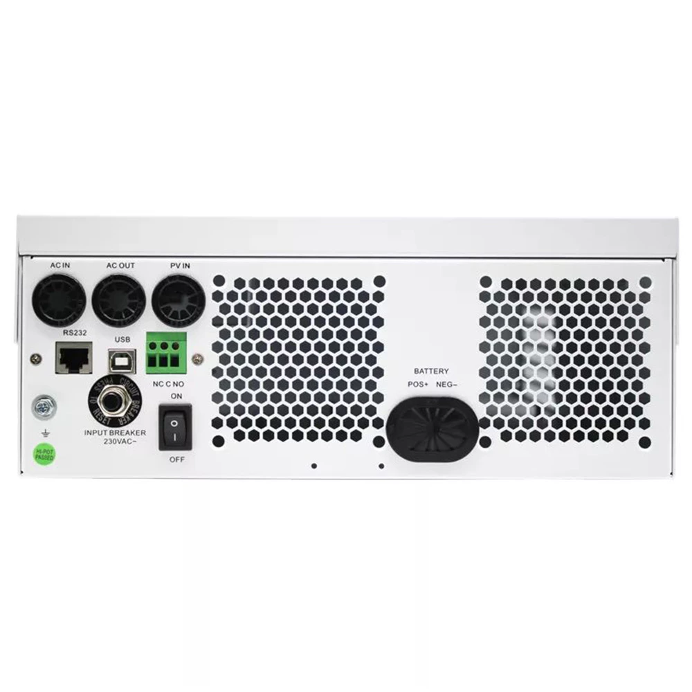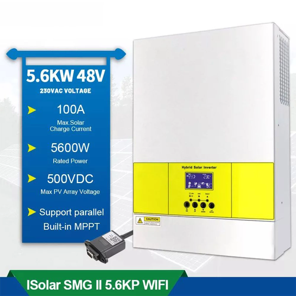 5600W 48VΒ solar inverterΒ features a high PV input voltage range, runs without battery, WiFi-GPRS remote monitoring (WiFi plug included), and a built-in parallel kit for 9 units parallel.
