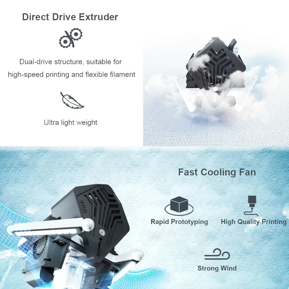 FLSUN V400 is designed with ultra-light short-range extruder, and the extrusion force can reach 70N, which can meet the needs of high-speed printing of 400mm/s, especially suitable for printing flexible consumables and hard consumables such as PLA.