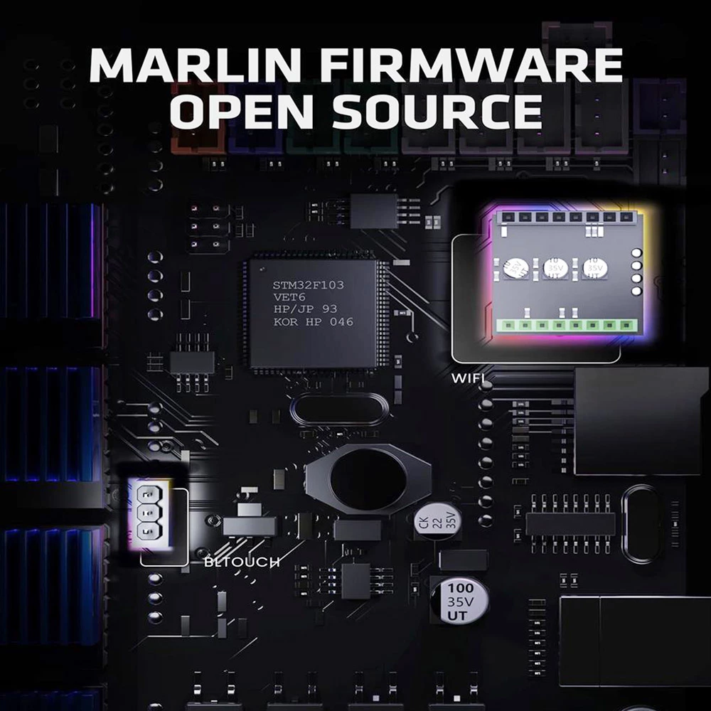It features a TMC2208 quiet stepper motor driver module, and the built-in 32-bit controller board configures open-source and resume print functions. Based on the source code, users can customize their 3D printers by adding modules such as Bltouch, and Wi-Fi.