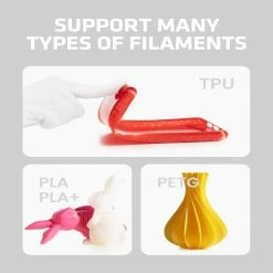 The direct drive is compatible with TPU, PLA+, and PETG filaments, allowing for easy filament loading without easy clogging, and features smart filament break detection.