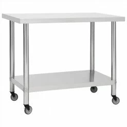 This work table is perfect for food preparation and service in a kitchen, restaurant, school and commercial space. This gastronomy worktable is made of stainless steel, durable for lifetime use. The smooth surface is corrosion-resistant and easy to clean. The bottom board offers extra storage space. The workbench features 4 moveable wheels so that you can move it around freely. In addition, 2 wheels have brakes to keep the table in place.
