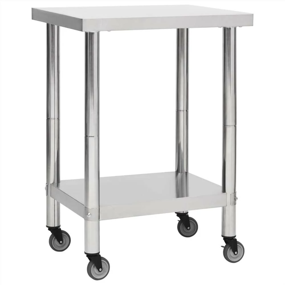 This work table is perfect for food preparation and service in a kitchen, restaurant, school and commercial space. This gastronomy worktable is made of stainless steel, durable for lifetime use. The smooth surface is corrosion-resistant and easy to clean. The bottom board offers extra storage space. The workbench features 4 moveable wheels so that you can move it around freely. In addition, 2 wheels have brakes to keep the table in place.