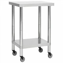 This work table is perfect for food preparation and service in a kitchen, restaurant, school and commercial space. This gastronomy worktable is made of stainless steel, durable for lifetime use. The smooth surface is corrosion-resistant and easy to clean. The bottom board offers extra storage space. The workbench features 4 moveable wheels so that you can move it around freely. In addition, 2 wheels have brakes to keep the table in place.