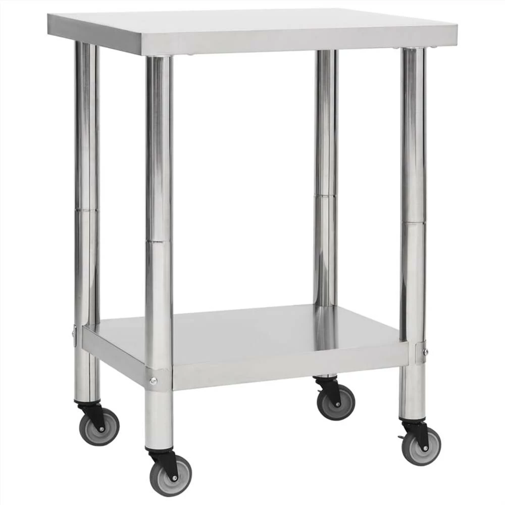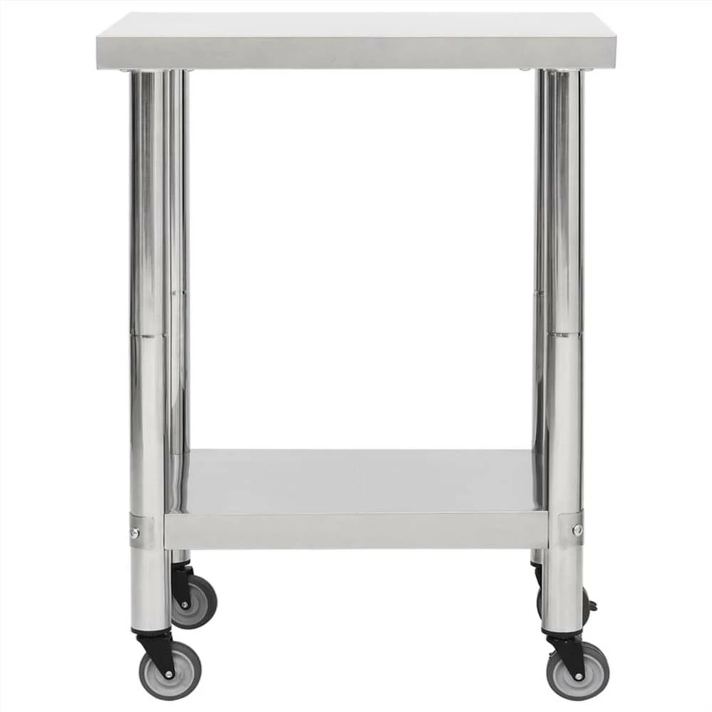 This work table is perfect for food preparation and service in a kitchen, restaurant, school and commercial space. This gastronomy worktable is made of stainless steel, durable for lifetime use. The smooth surface is corrosion-resistant and easy to clean. The bottom board offers extra storage space. The workbench features 4 moveable wheels so that you can move it around freely. In addition, 2 wheels have brakes to keep the table in place.