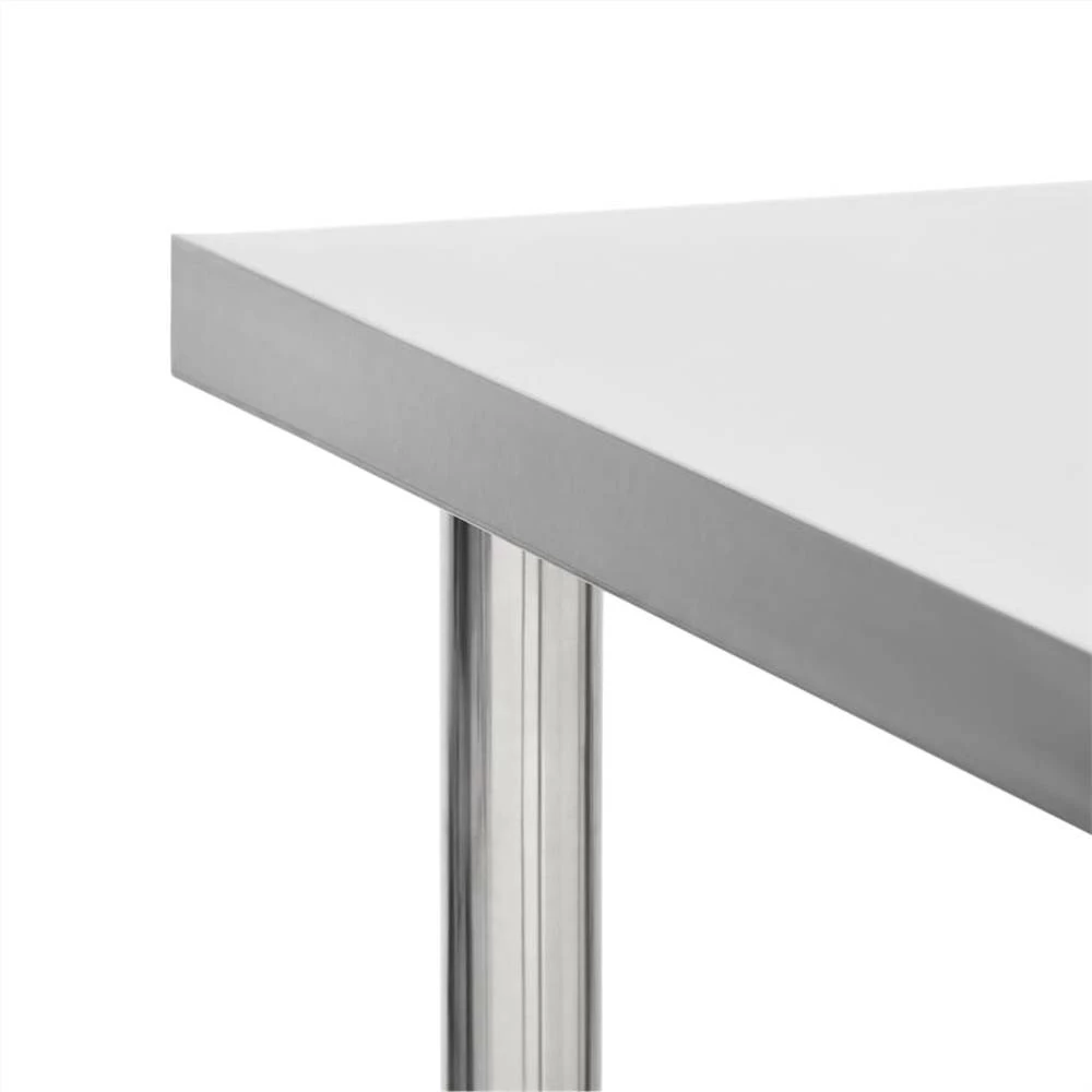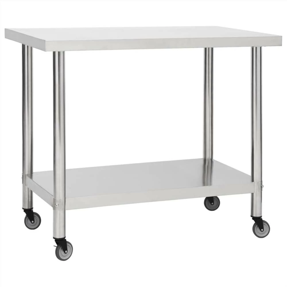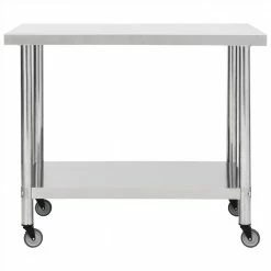 This work table is perfect for food preparation and service in a kitchen, restaurant, school and commercial space. This gastronomy worktable is made of stainless steel, durable for lifetime use. The smooth surface is corrosion-resistant and easy to clean. The bottom board offers extra storage space. The workbench features 4 moveable wheels so that you can move it around freely. In addition, 2 wheels have brakes to keep the table in place.