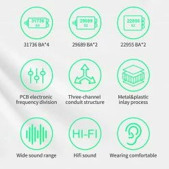 | Headphone Details | Vocalism Principle: Balance Armature Cavity Material: Metal&Plastic Frequency Response Range: 20-40000Hz Resistance: 18Ξ© Sensitivity: 114dB Connectors: 3.5mm Line Length: 120cmΒ±3cm Communication: Wired Wire Upgrading: Yes |
