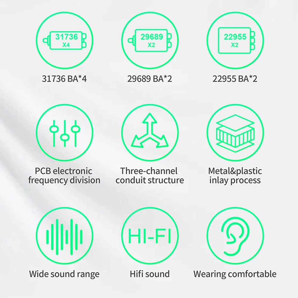 The combination of 8 BA covers the complete sound range of low, medium and highΒ frequencies, and the overall frequency response range is as high as 20Hz-40000Hz, bringing shocking auditory effects.