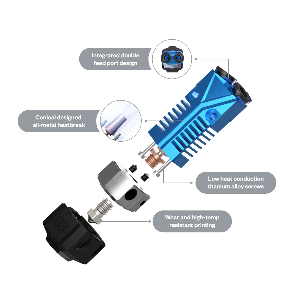 Conical designed all-metal heatbreak, fit closely with heatsink, heat dissipation more sufficient, meet the requirements of high-temperature filaments printing.