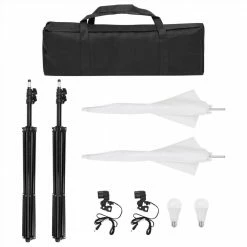 This photo studio kit is an ideal choice for photographing in the studio or on location. Excellent lighting performance: By using the daylight lamps with a colour temperature of 5500 Kelvin, it is possible to capture your subject in a natural way. The two white umbrellas provide soft light, so harsh shadows are avoided.Flexible background system: The flexible background system is easy to set up and can be combined with backdrop which has no seams and is colourfast. Each stand has a 1/4 inch standard thread suitable for analog and digital cameras.Easy storage: Thanks to the included carrying bag, the kit is easy to store and carry.