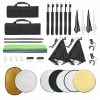 This photo studio kit is an ideal choice for photographing in the studio or on location. Excellent lighting performance: By using the daylight lamps with a colour temperature of 5500 Kelvin, it is possible to capture your subject in a natural way. The three umbrellas provide soft light, so harsh shadows are avoided.Flexible background system: The flexible background system is easy to set up and can be combined with backdrop which has no seams and is colourfast. Each stand has a 1/4 inch standard thread suitable for analog and digital cameras.Useful reflector set: Each reflector comes with different surface panels. You can work with different combinations for warmer or cooler lights for both indoor and outdoor photography.Easy storage: Thanks to the included carrying bag, the kit is easy to store and carry.