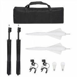 This photo studio kit is an ideal choice for photographing in the studio or on location. Excellent lighting performance: By using the daylight lamps with a colour temperature of 5500 Kelvin, it is possible to capture your subject in a natural way. The two white umbrellas provide soft light, so harsh shadows are avoided.Flexible background system: The flexible background system is easy to set up and can be combined with backdrop which has no seams and is colourfast. Each stand has a 1/4 inch standard thread suitable for analog and digital cameras.Useful reflector set: Each reflector comes with different surface panels. You can work with different combinations for warmer or cooler lights for both indoor and outdoor photography.Easy storage: Thanks to the included carrying bag, the kit is easy to store and carry.