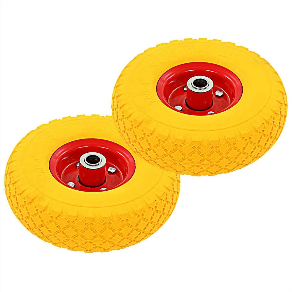 These puncture-proof sack truck spare wheels are ideal for heavy-duty use when moving loads with your sack trucks, hand trucks, trolleys, carts, dollies, wheelbarrows, etc., even on uneven grounds. The pneumatic tyres are made of durable, abrasion-resistant rubber and have a special tread design that provides added grip at higher speeds. The wheel rims are made of sturdy metal. The spare trolley wheels have a universal size and can be easily installed to your sack trucks, trolleys, etc. Delivery includes 4 wheels.