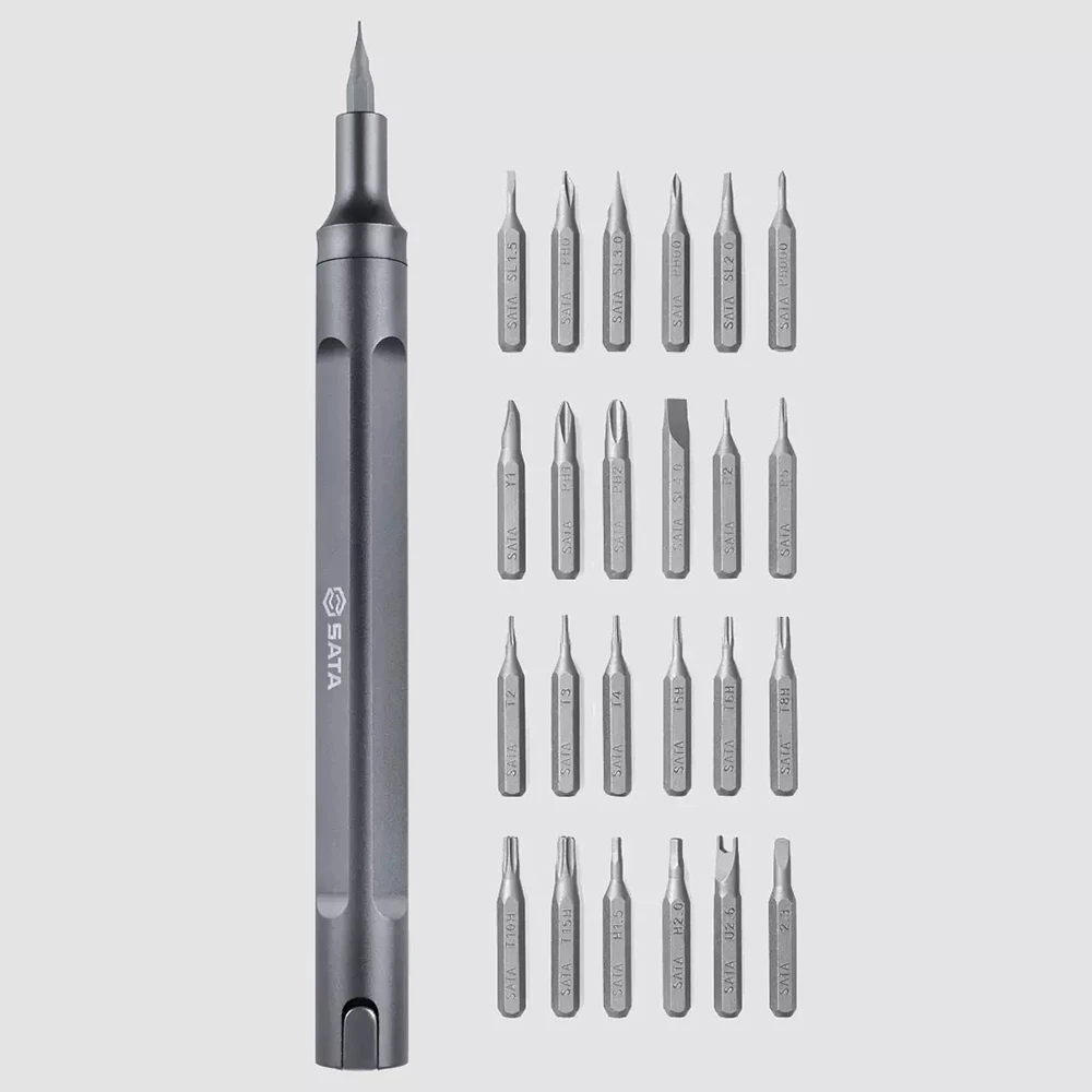 SATA 25-piece multifunctional screwdriver set includes PH000, PH00, PH0, PH1, PH2, SL1. 5, SL2. 0, SL3. 0, SL4. 0, P2, P5, T2, T3, T4, T5H, T6H, T8H, T10H, T15H, H1. 5, H2. 0, U2. 6, Y1, Delta 2. 3 bits and a screwdriver pen.
