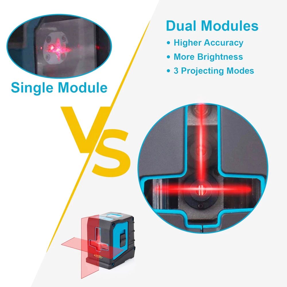 The Tilswall cross line laser can easily be switched between vertical/horizontal/cross lines. With DUAL-LASER MODULE we offer higher accuracy, higher brightness, and higher efficiency.