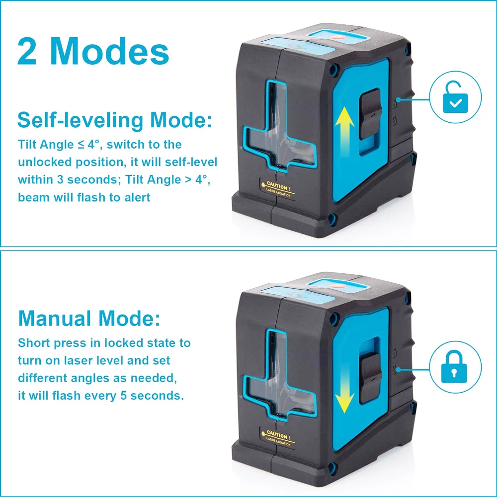 Automatic leveling: If it is within a horizontal/vertical range of 4 Β°, it will be automatically leveled within 3 seconds. If it’s out of range, the laser beam will flash to alert. Manual adjustment: lock the pendulum, you can adjust the tilt angle of the fixed laser.
