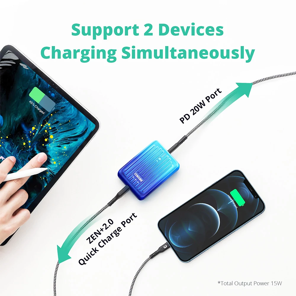 20W Quick Charge &Power Delivery: 20W PD input/ output USB-C port allows the portable phone charger to charge iPhone 13-8 to 50% only 30 minutes. Charging faster than the ordinary power supply. The USB-A port has exclusive ZEN+2.0 technology that supports almost all quick charge 3.0 compatible devices, take easy to power your devices.
